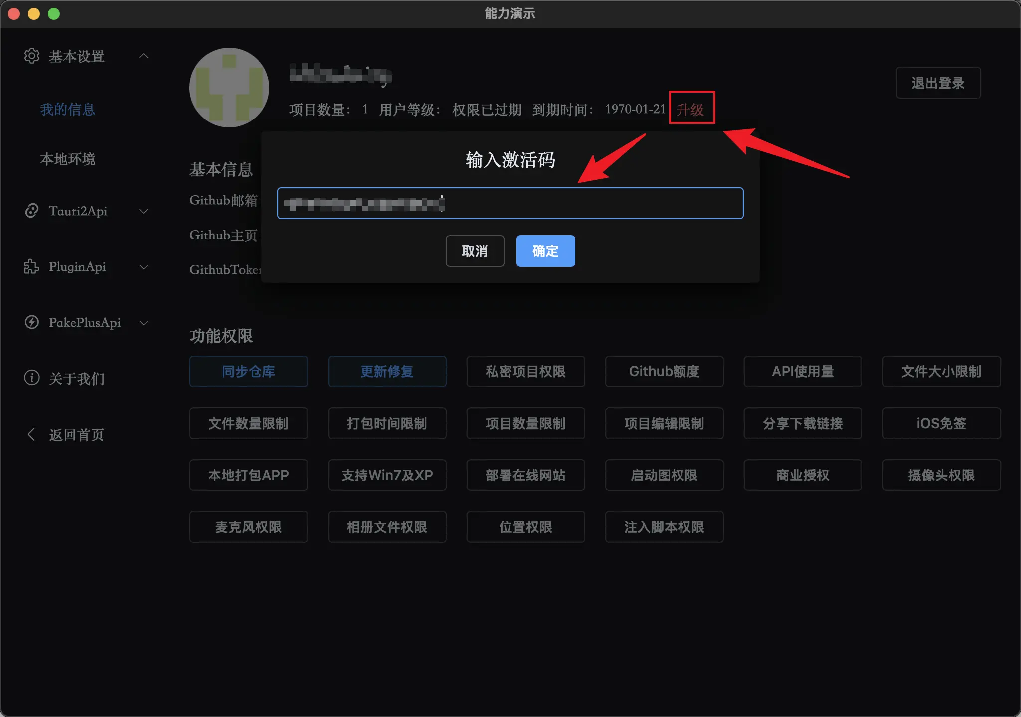 拿到激活码之后,到 PakePlus 软件首页右上角,点击头像进入 我的信息 页面: